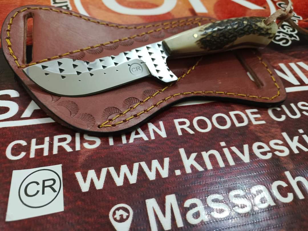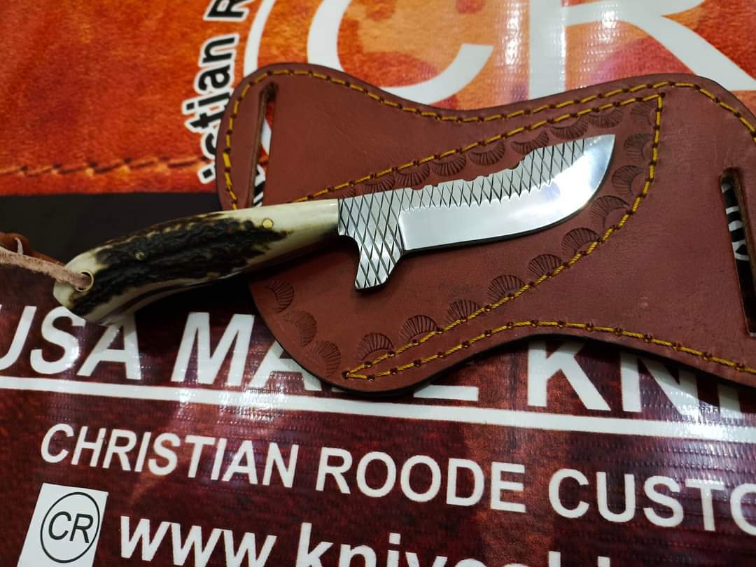 Beautiful handmade custom skinner knife made with hoof rasp steel and stag handle.